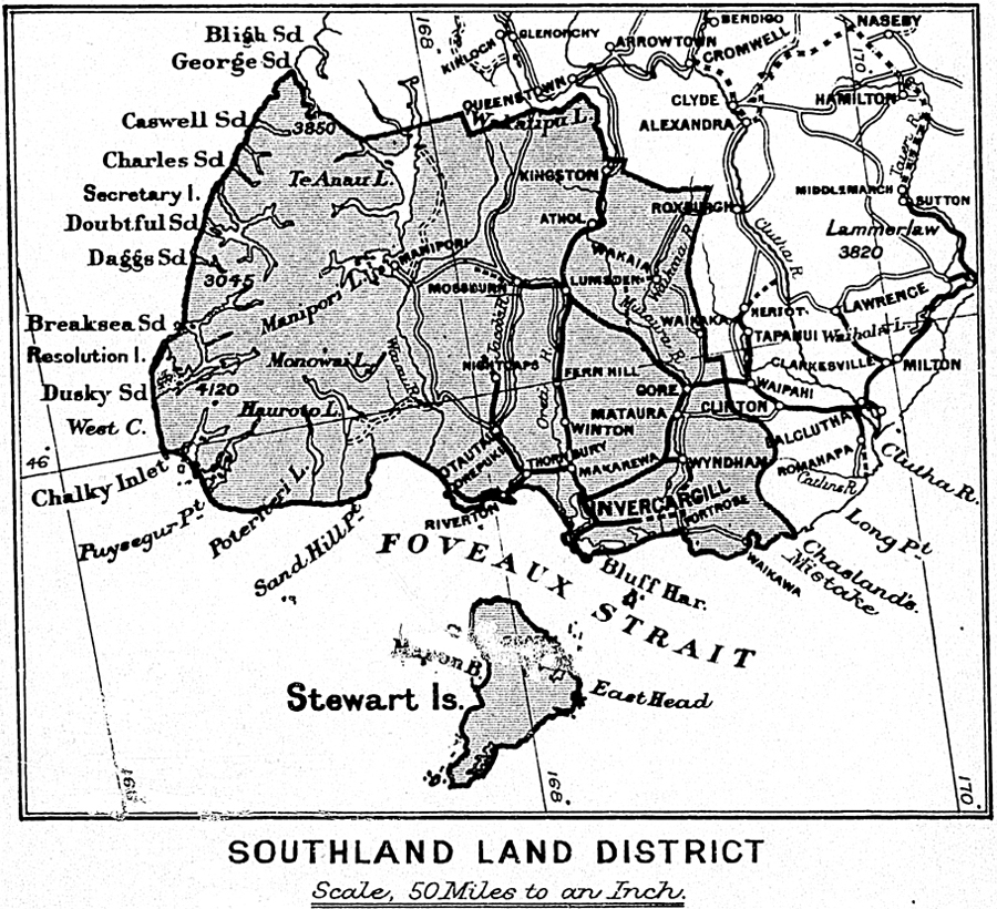 The South or Stewart Island, and adjacent islets, having an area of 665 square miles, or 425,390 acres.