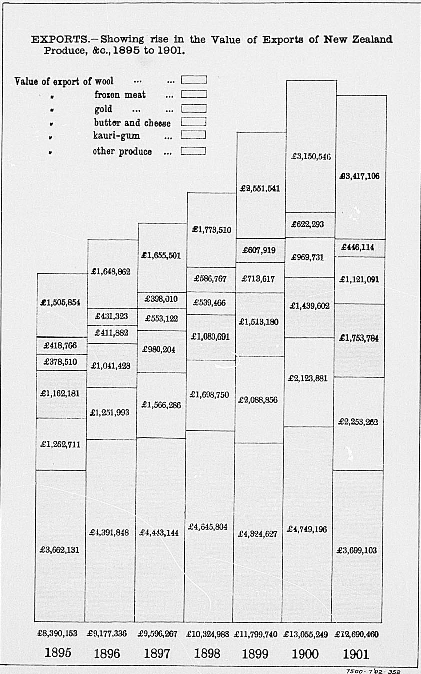 New Zealand is, besides, a mining country. Large deposits of coal are met with, chiefly on the west coast of the Middle Island. Gold, alluvial and in quartz, is found in both islands, the yield having been over fifty-nine millions sterling in value to the present time. Full statistical information on this subject is given further on, compiled up to the latest dates.
