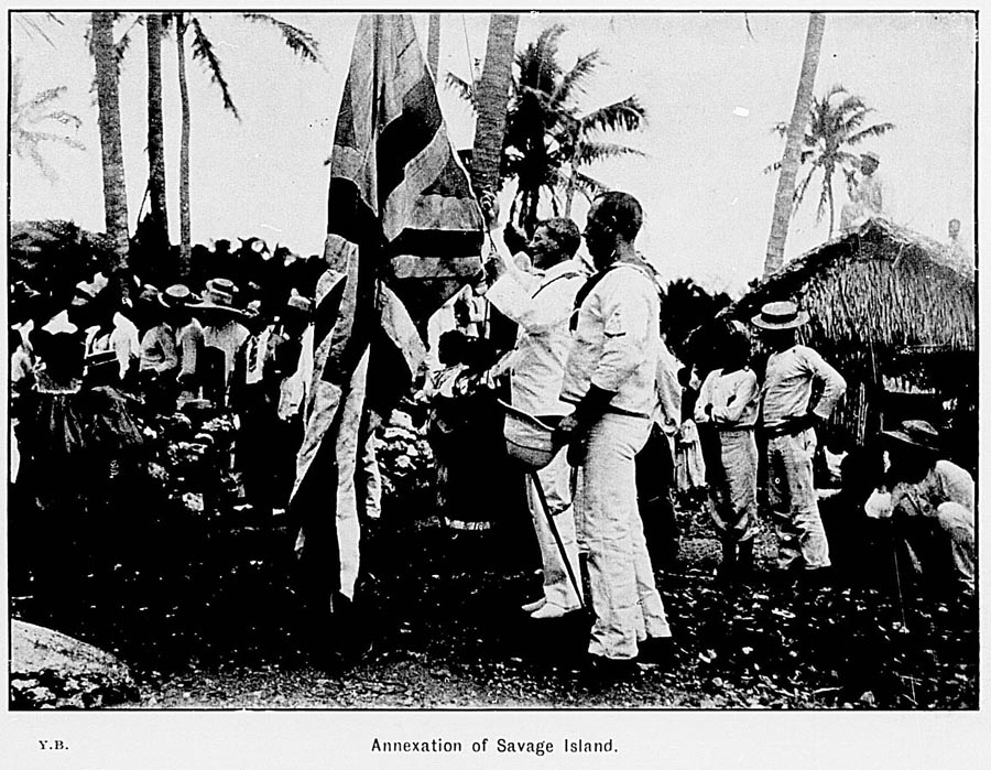 Niue.—Distance from Rarotonga, 580 miles; circumference, 40 miles; height, 200 ft.; area, about 100 square miles.